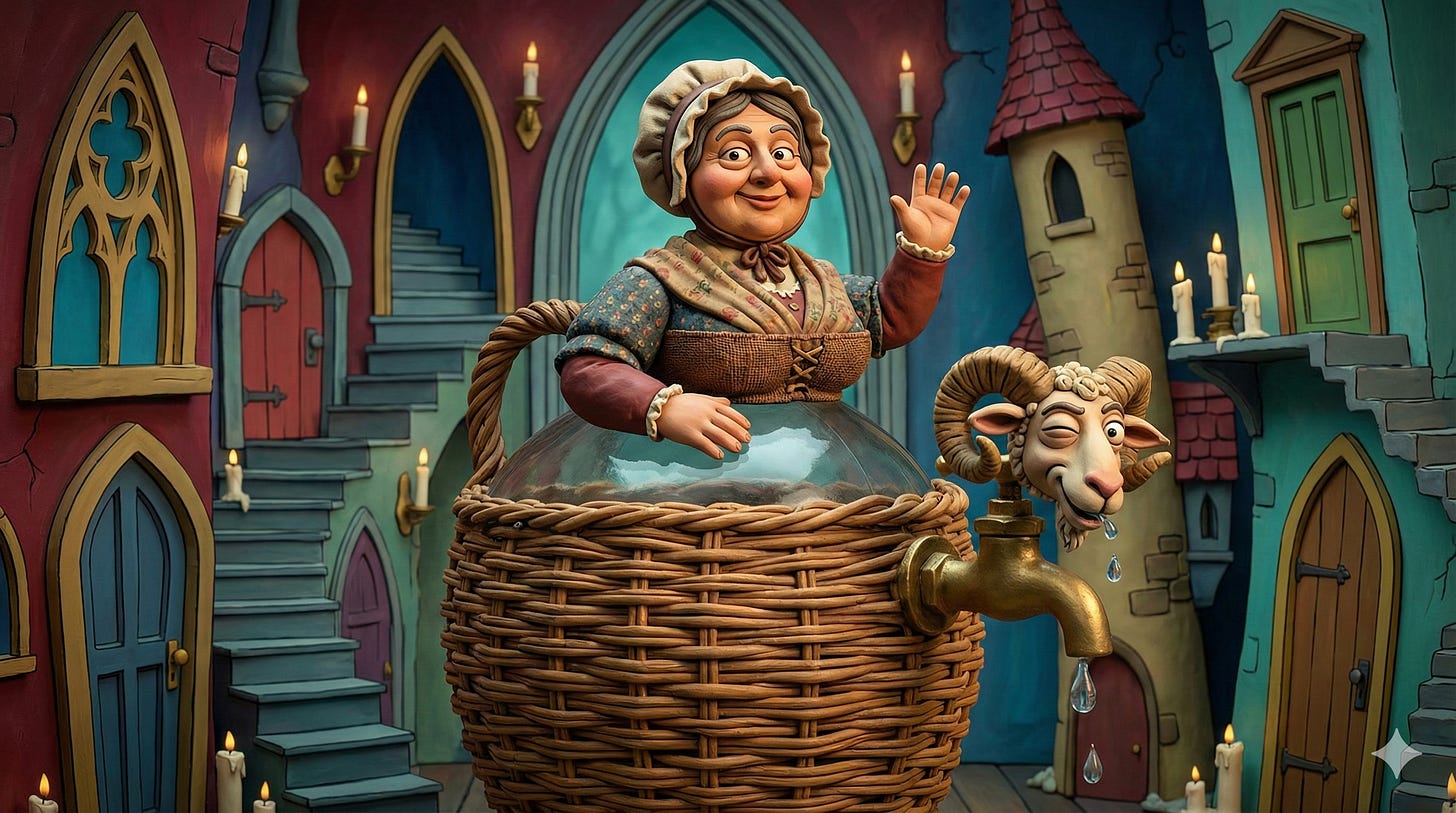 Quando il fiasco aumenta di dimensione diventa una damigiana, sempre con la sua gonnellina di vimini (oggi perlopiù di plastica). Se volessimo personificare la damigiana, la potremmo immaginare come una signora dai fianchi larghi. Ed è quello che hanno fatto in Francia, sembra in ambiente marinaro, dove la damigiana è stata chiamata dame jeanne, ovvero sora gianna. E dame jeanne in Italia è diventata damigiana, la quale, al giorno d’oggi, può anche essere fornita di rubinetto, che, oltre ad essere, come termine arcaico, il diminutivo di rubino, pietra preziosa di gran pregio, indica, appunto, l’organo di regolazione del flusso di un fluido. Rubinetto deriverebbe dal francese robinet, diminutivo di Robin, a sua volta vezzeggiativo di Robert. Aldo Gabrielli (Nella Foresta del Vocabolario) ci racconta che il termine Robin si usava popolarmente con il significato spregiativo di sciocco, babbeo ed indicò anche il pecorone a quattro zampe, il montone, con la cui testa si ornava il suddetto regolatore del flusso, per cui quest’ultimo finì prendere il nome di robinet, ovvero piccolo robin, piccolo montone.