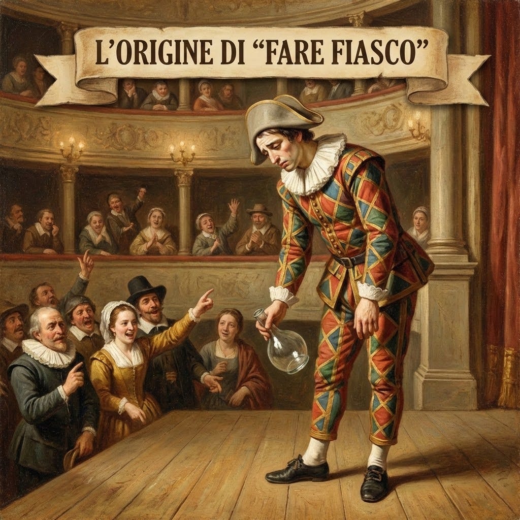 “ Fiasco” ha origine dal germanico flasko, con il quale venivano indicati recipienti rivestiti di vimini o di sala.