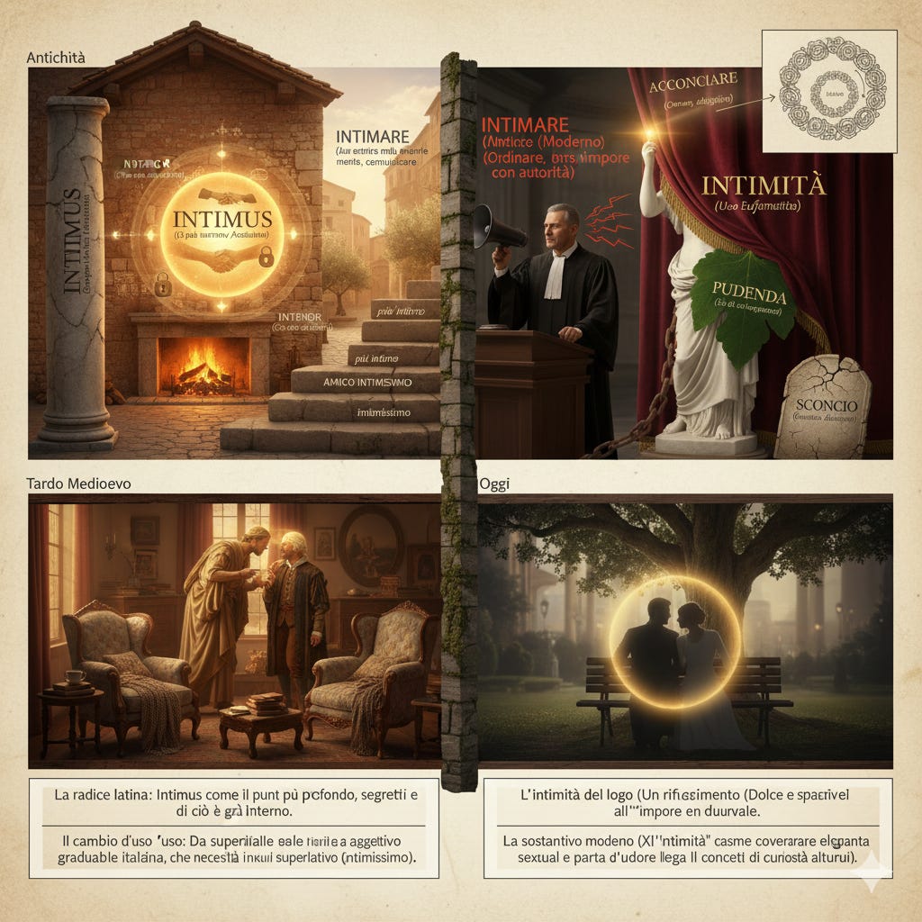 Nella lingua latina troviamo l’aggettivo intimus (dalla preposizione in, dentro, col suffisso – timus), il quale veniva usato come superlativo di interior. Così interior indicava ‘ciò che sta dentro’ e poteva essere la ‘parte interna’ della casa o di altro luogo oppure ‘ciò che è più intrinseco’ come l’amicizia. A sua volta, intimus, in quanto superlativo, indicava ‘il più interno’, come, rimanendo agli esempi appena fatti, ‘la parte più interna’ di un luogo ovvero ‘ciò che è più profondo o segreto’ (intima philosophia , il cuore della filosofia , intima consilia , i progetti più segreti) o ‘ciò che è strettamente unito’, quel che noi chiamiamo, appunto, ‘intimo’, quale una amicizia strettissima.