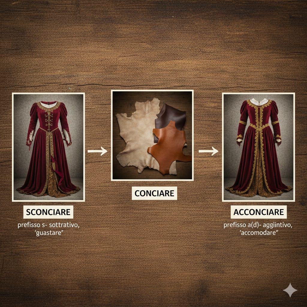 Se conciare con s- negativo-sottrattivo ha generato sconciare di cui sopra, con a(d)- aggiuntivo ha dato vita ad acconciare, con il quale torniamo ai significati positivi di accomodare, abbigliare e simili.